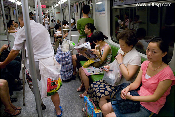 上海地铁乞丐。 他是一条腿,后面的口袋里装满空饮料瓶。图片号:shanghai801C. Shanghai metro, one-leg beggar, his bag was full of used cans. Photo ID: Shanghai801C.