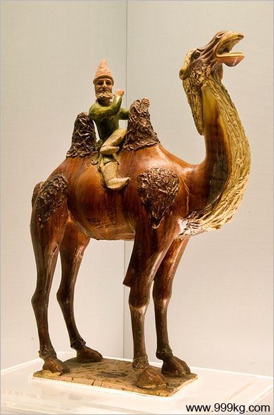Polychrome glazed pottery figurine of man blowing musical instrument on camel, Tang (A.D. 618-907). A shanghai Museum collection. Photo ID: Shanghai802AP.
