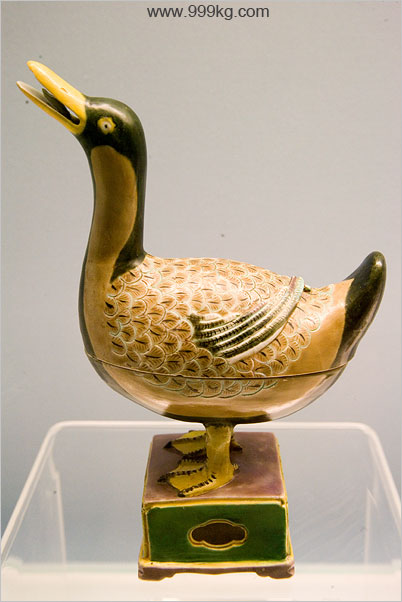 景德镇窑,素三彩鸭形香熏。明成化(公元1465-1487)