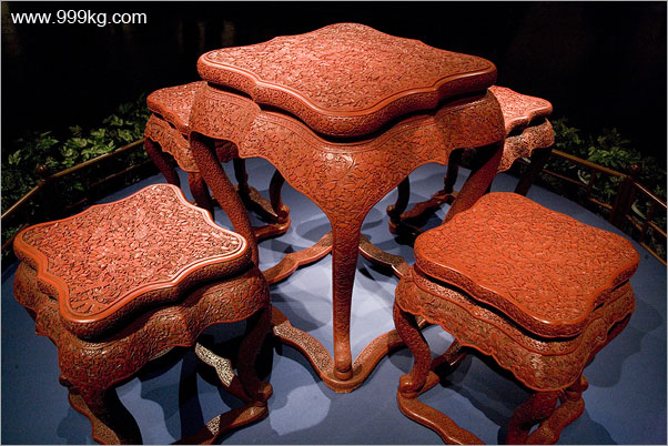 剔红花卉纹方桌,凳。上海博物馆藏清朝家具