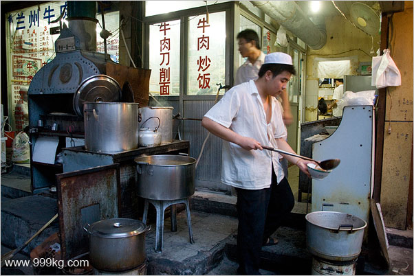 这是上海锦江乐园附近的一个清真面食店。在上海的一个月很多次为了图方便省钱我就在这里解决一餐,牛肉拉面每碗4元。正在舀汤的小伙子名叫王真,去年从青海省大通县城关镇来上海打工。他在这里每天从早上一直工作到晚上10点,每个月工资六百元。在餐馆工作,老板包吃的。深夜餐馆卫生打扫完毕就睡在店面里。“这张照片我回去打印一张寄给你吧”,我说。王真听了很高兴,不过他说他不会在这里做很久了,让我把照片寄到他青海家里。“我想回家了。”他说。