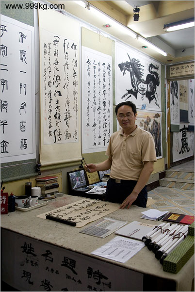 说实话我对江苏周庄乃至全国各地的旅游纪念品商店都没有一点兴趣,大家都卖一样的东西。但这次在周庄我却被一家字画店的作品所吸引。老板张鸿千都是现场写字作画,店里都是他自己的作品,此乃高手所为。张先生是和刚刚去世的画家陈逸飞一起都是最早来周庄的人,那还是在1985年。张先生从那时起就一直在周庄生活(这一点我很佩服,周庄的商业化气息浓厚,卫生也差,要我在这里呆上一年半载我估计会疯了去)。张先生租的这间店面不到30平方米,平均每月能为他带来七八千元的收入。